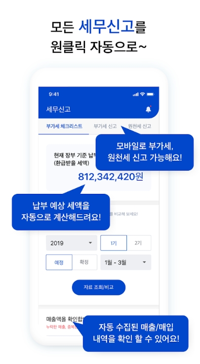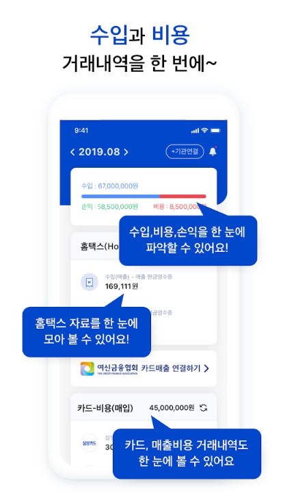 - 매출, 비용, 입출금 거래를(카드, 은행, 홈택스, 여신금융협회 등) 자동으로!