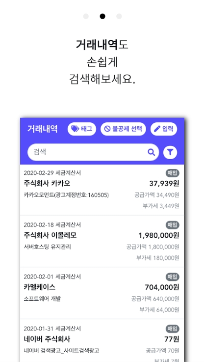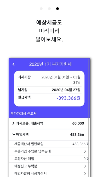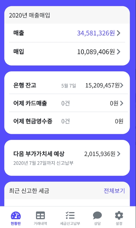▶ 복잡한 세무업무를 빠르고 쉽게 처리해주네요. 카드나 계좌 연결이 쉽게 되어 매입매출 내역을 자동으로 업데이트합니다. 아직 사용 초기단계지만 큰 도움을 받을 수 있을 것 같습니다.